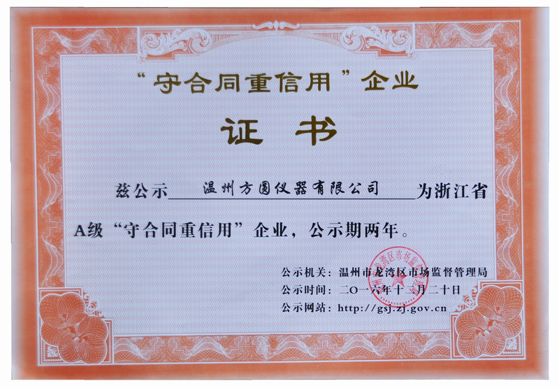 熱烈慶祝溫州方圓儀器有限公司獲得守合同重信譽(yù)企業(yè)證書(shū)